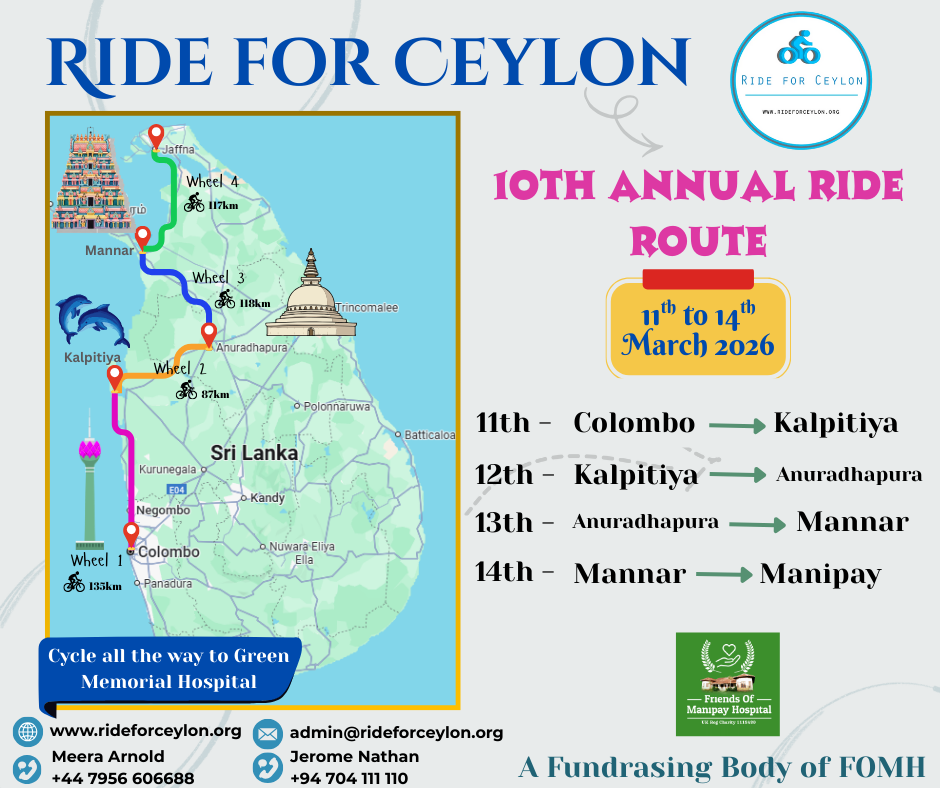 Each mile ridden contributes directly to the restoration of Manipay Green Memorial Hospital, bringing vital healthcare back to communities in the Northern Province affected by years of conflict.